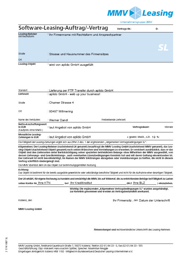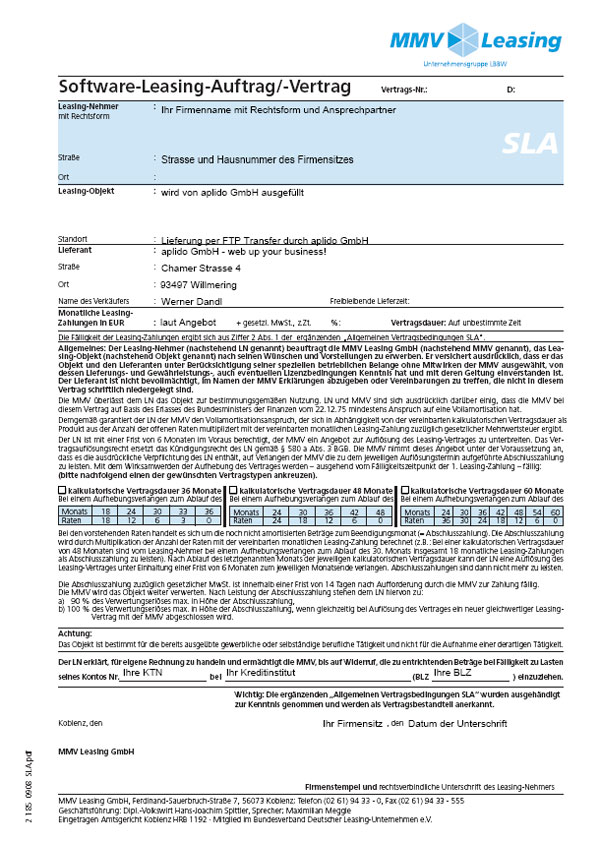 Wir haben Ihnen hier unsere beiden Software Leasing-Vertäge mit einer Ausfüllanleitung als PDF-Datei zum Download bereitgestellt. Bitte füllen Sie den entsprechenden Vertrag gemäß unserem Angebot aus und senden Sie diesen per Post oder per Fax an uns zurück.